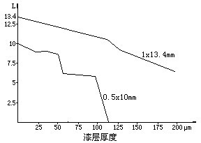 每涂刷一次油漆,待其干涸后,用千分尺測量漆層厚度(鋼板總厚度減去事先測定的鋼板板材厚度),并進行一次粉探傷測試,記錄觀察結(jié)果,然后再涂刷一遍油漆,重復(fù)上述步驟,直到漆層厚度達到198微米。由于一直是在同一個缺陷部位測試,可以避免人工缺陷、鋼板厚度以及鋼板材料成分和冶金組織變化造成的影響。